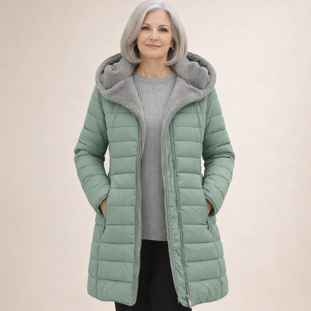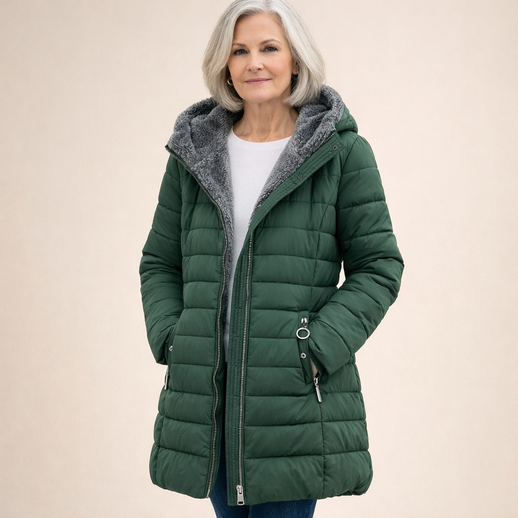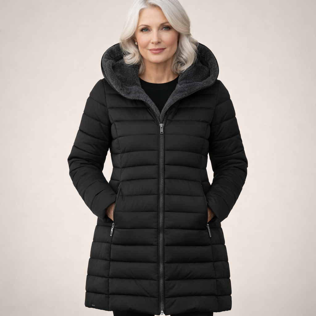 Damska kurtka o długości do połowy uda z poziomym pikowaniem i wygodnym kapturem obszytym miękkim materiałem. Posiada praktyczny zamek błyskawiczny na całej długości oraz dwie boczne kieszenie zapinane na suwaki. Luźniejszy krój i staranne wykończenia sprawiają, że kurtka wygląda stylowo, a jednocześnie świetnie chroni przed zimnem.