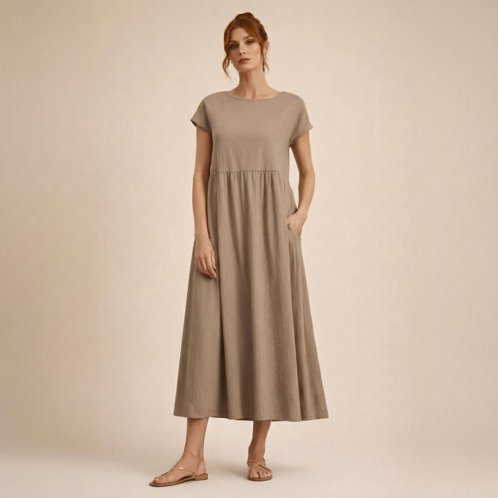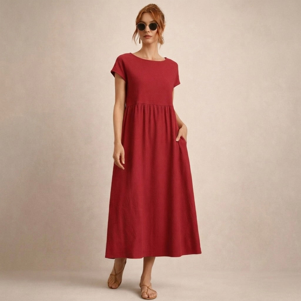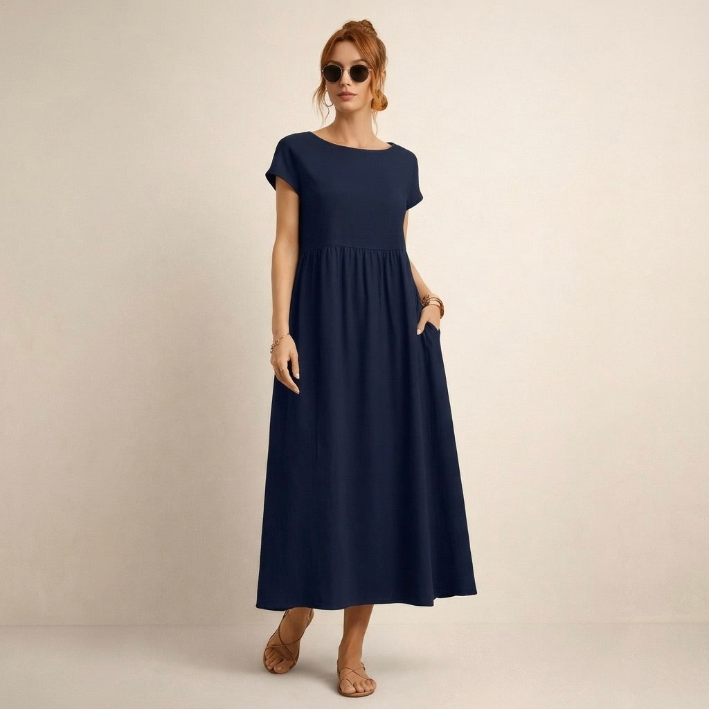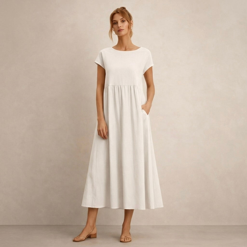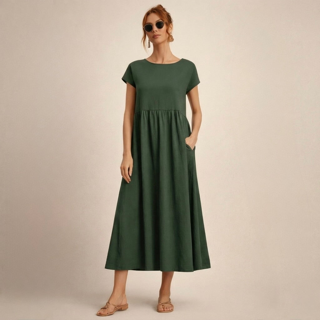 Ta swobodna sukienka midi posiada prosty, okrągły dekolt oraz krótkie rękawy, które tworzą ponadczasowy i minimalistyczny wygląd. Delikatne marszczenie w talii nadaje lekiej struktury, jednocześnie pozwalając spódnicy swobodnie opadać w luźnym kroju. Luźny fason zapewnia komfort ruchu, a praktyczne boczne kieszenie dodają funkcjonalności na co dzień.