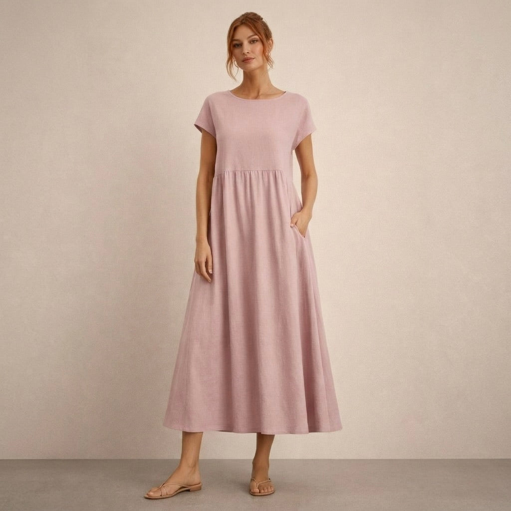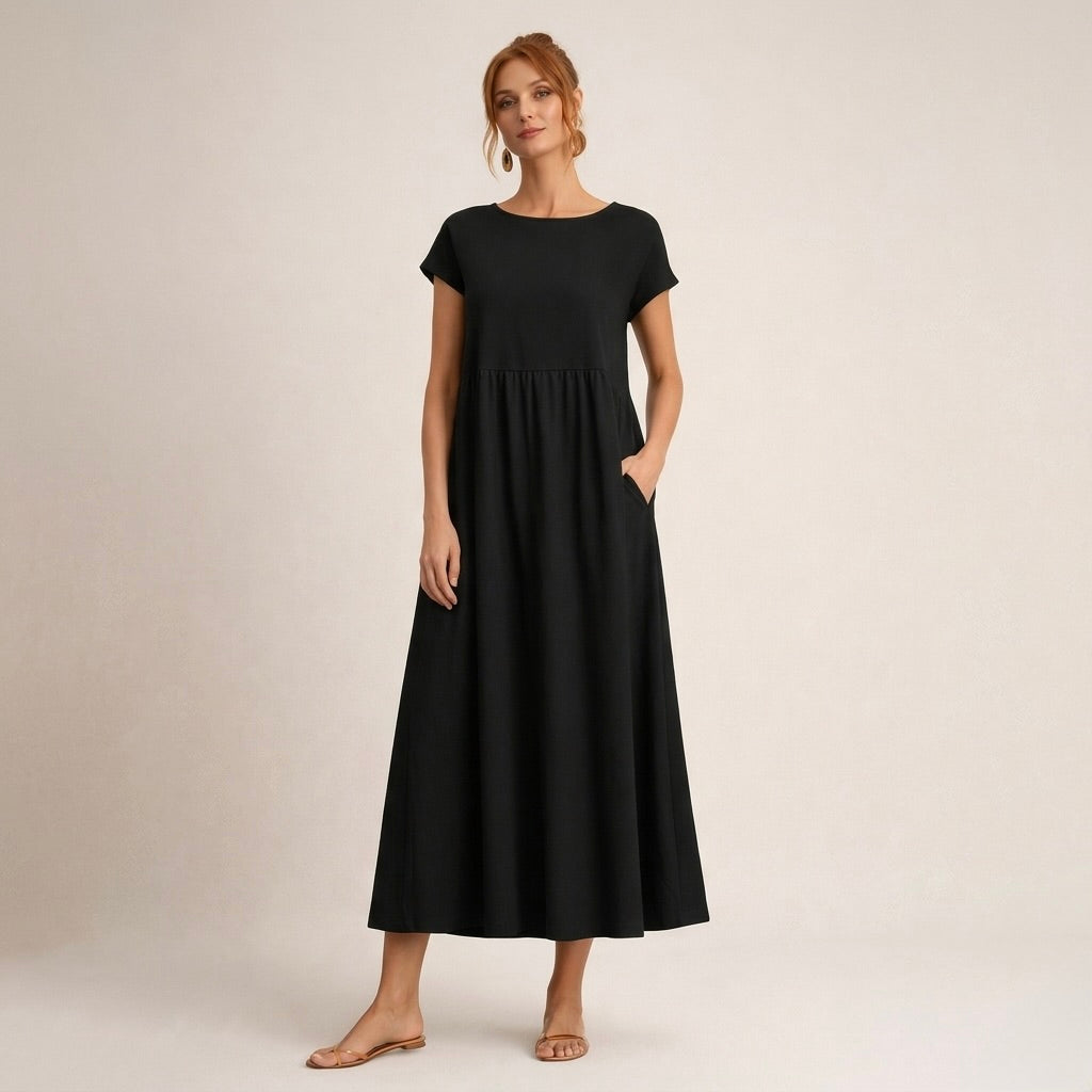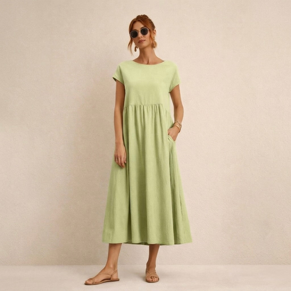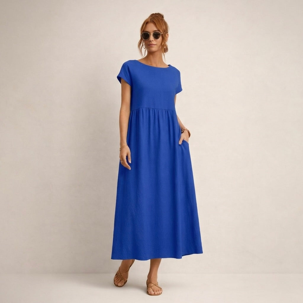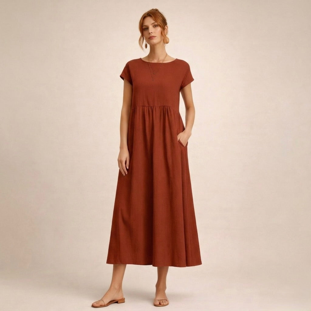 Ta swobodna sukienka midi posiada prosty, okrągły dekolt oraz krótkie rękawy, które tworzą ponadczasowy i minimalistyczny wygląd. Delikatne marszczenie w talii nadaje lekiej struktury, jednocześnie pozwalając spódnicy swobodnie opadać w luźnym kroju. Luźny fason zapewnia komfort ruchu, a praktyczne boczne kieszenie dodają funkcjonalności na co dzień.
