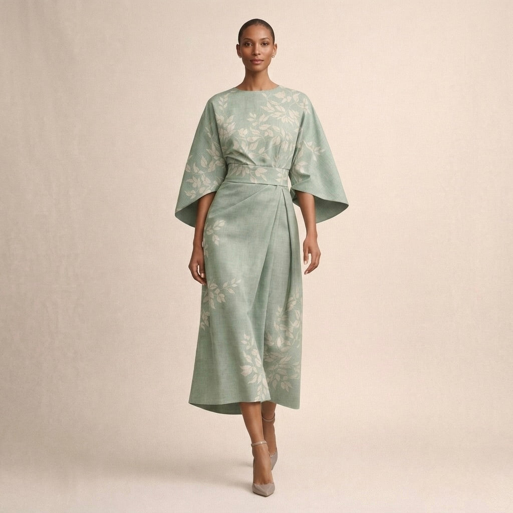 Sukienka ma klasyczny, zabudowany dekolt oraz luźniejsze rękawy o szerokim kroju, które swobodnie układają się przy ruchu. W talii znajduje się dopasowanie podkreślające sylwetkę, a dół opada w długości midi, tworząc elegancką, prostą linię. Całość zdobi wyrazisty, kwiatowy wzór rozłożony na całej powierzchni materiału.