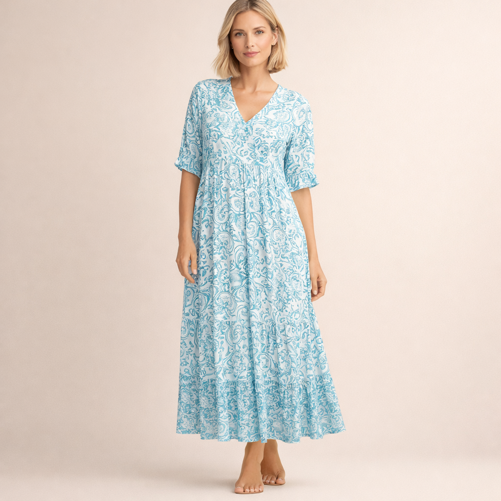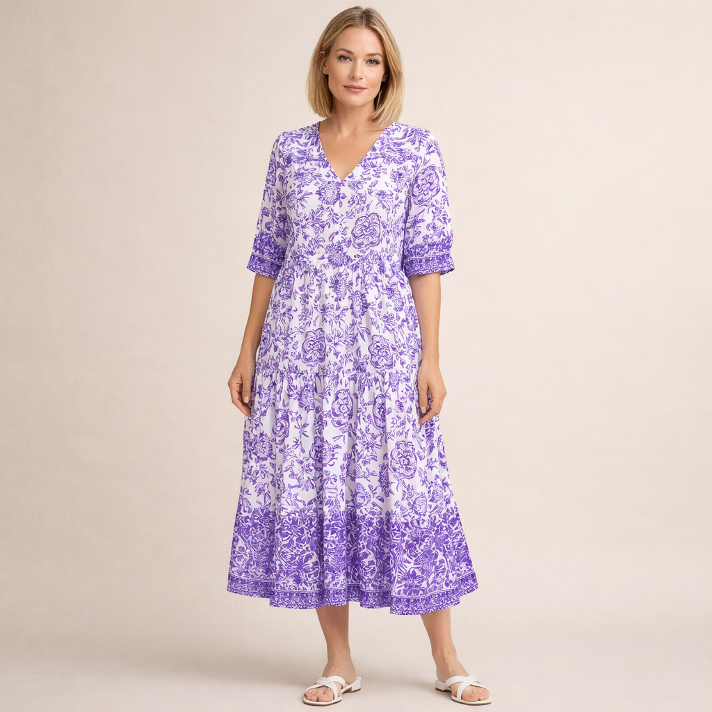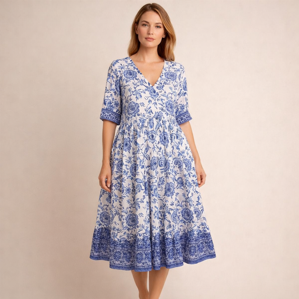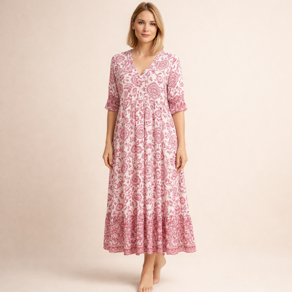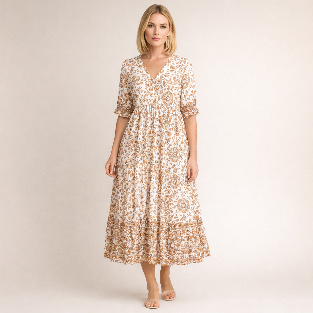 Ta sukienka posiada dekolt w kształcie litery V oraz rękawy o długości do łokcia z ozdobnym wykończeniem. Górna część jest lekko dopasowana, a pod linią biustu materiał jest delikatnie marszczony. Spódnica o długości midi swobodnie się rozszerza i ozdobiona jest dekoracyjnym wzorem kwiatowym z ozdobnym pasem przy dolnym brzegu.